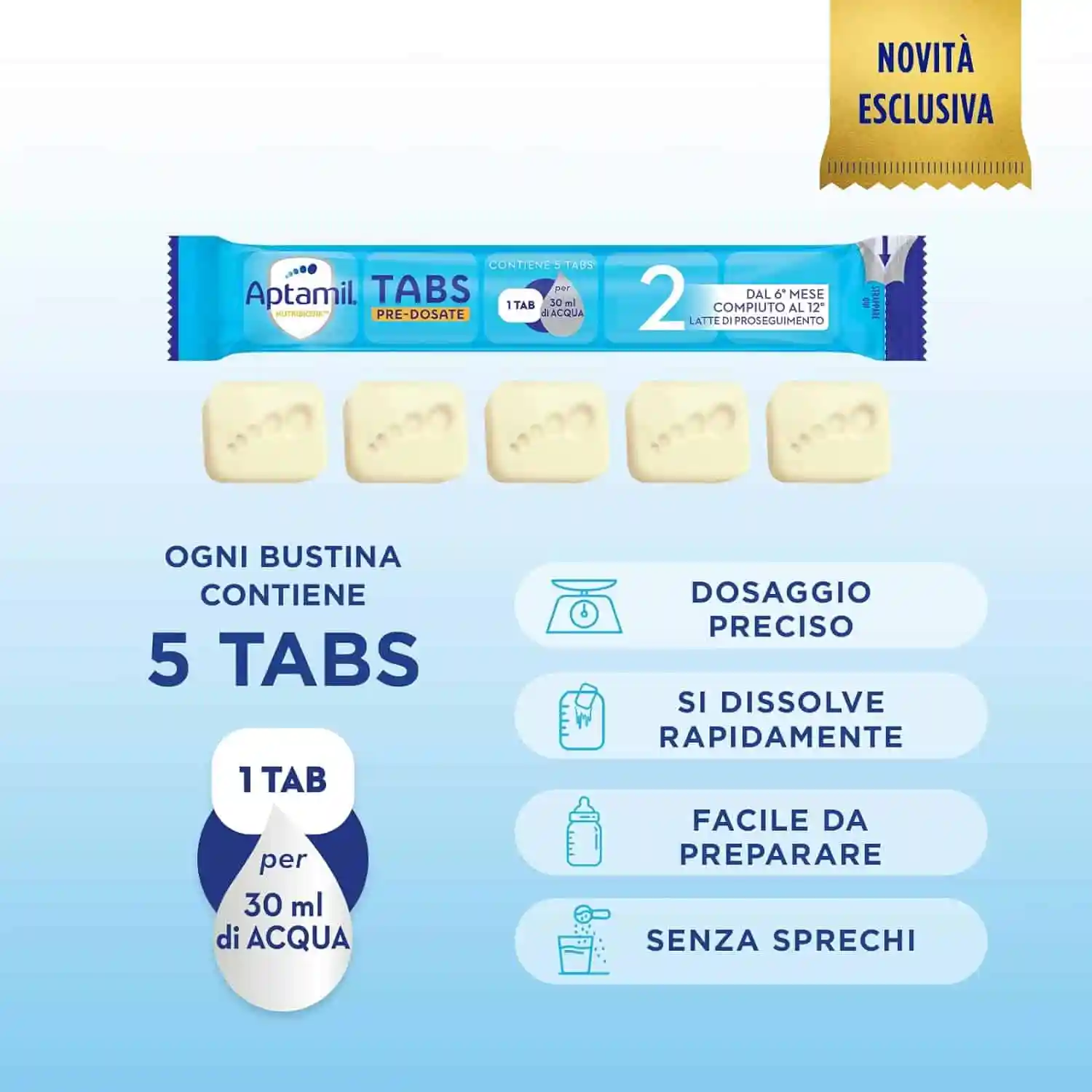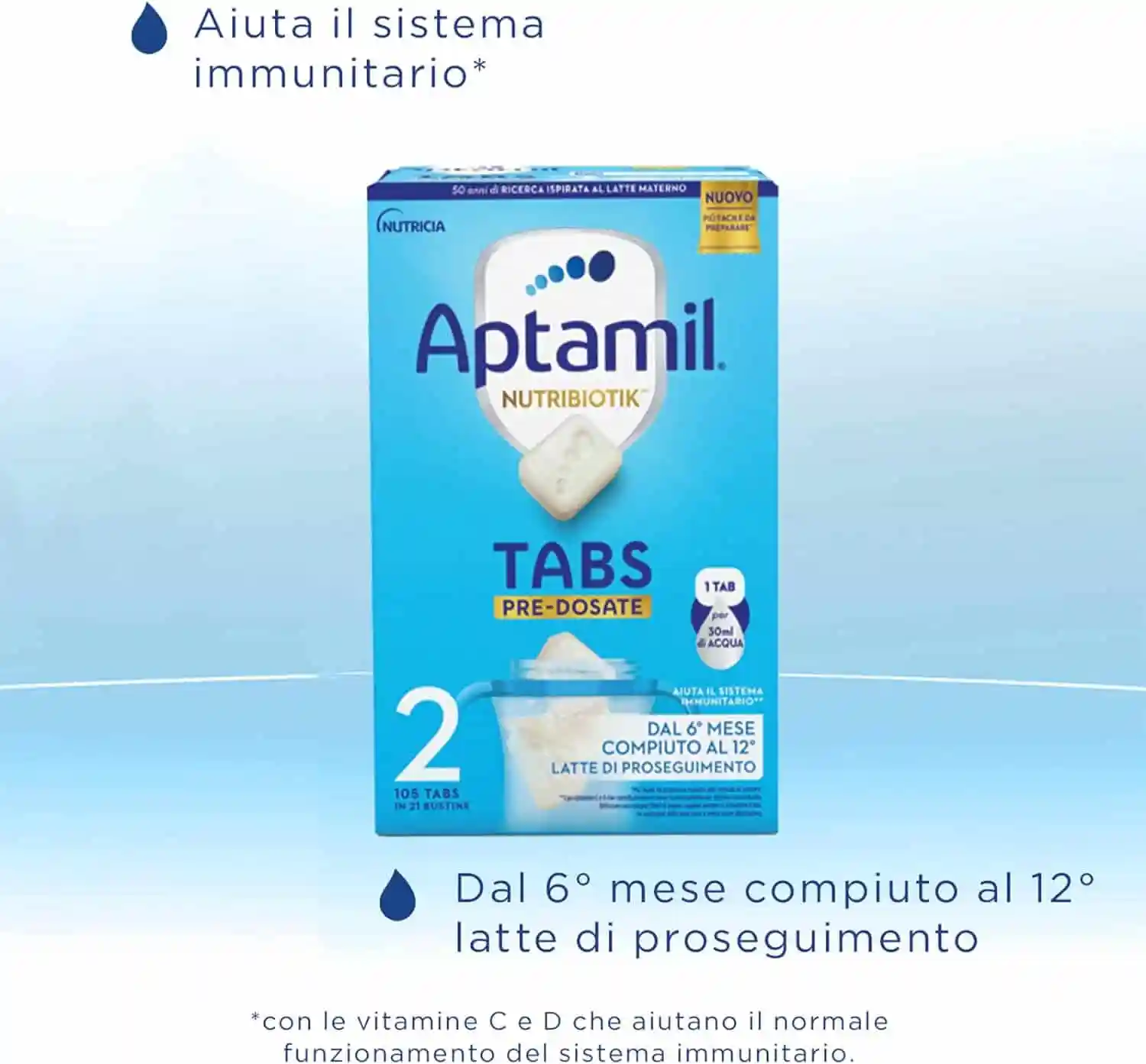 L’inizio della vita del tuo bambino è un momento speciale. E’ bello, a volte imprevedibile e impegnativo. Avrai molto a cui pensare a noi vogliamo esserti accanto in ogni momento, che sia la sua prima gita fuori casa o la poppata notturna. Da 50 anni, ci dedichiamo alla ricerca e alo studio del latte materno e della sua importanza per la nutrizione. APTAMIL Nutribiotik Tabs è un Latte di Proseguimento in tabs pre-dosate. La confezione è composta da 21 bustine per un totale di 105 tabs, 504g. Il prodotto è indicato per l’alimentazione dei bambini dal 6° mese compiuto fino al 12 mese, sotto il controllo del pediatra, all’interno di una dieta varia ed equilibrata. Aptamil 2 Nutribiotik Tabs è più facile da preparare, più facile da portare fuori casa rispetto alla formula in polvere. Ti accompagnerà durante tutti i momenti della tua giornata facilitando il momento della preparazione. Senza misurino, Senza sprechi e senza stress. AVVERTENZE IMPORTANTI: raccomandato come alimento esclusivo fino al 6° mese e come componente lattea di una dieta equilibrata durante lo svezzamento e anche dopo l’anno di vita. Quando manca, è consigliabile utilizzare un latte per lattanti esclusivamente dietro consiglio del Pediatra. Aptamil Nutribiotik Tabs 2 Pre-Dosate è idoneo per il lattante solo dopo il compimento del 6° mese, non deve essere utilizzato come sostituto del latte materno nei primi 6 mesi di vita ed è da intendersi come parte di un’alimentazione diversificata. L’inizio dello svezzamento deve avvenire solo seguendo le indicazioni del Pediatra.