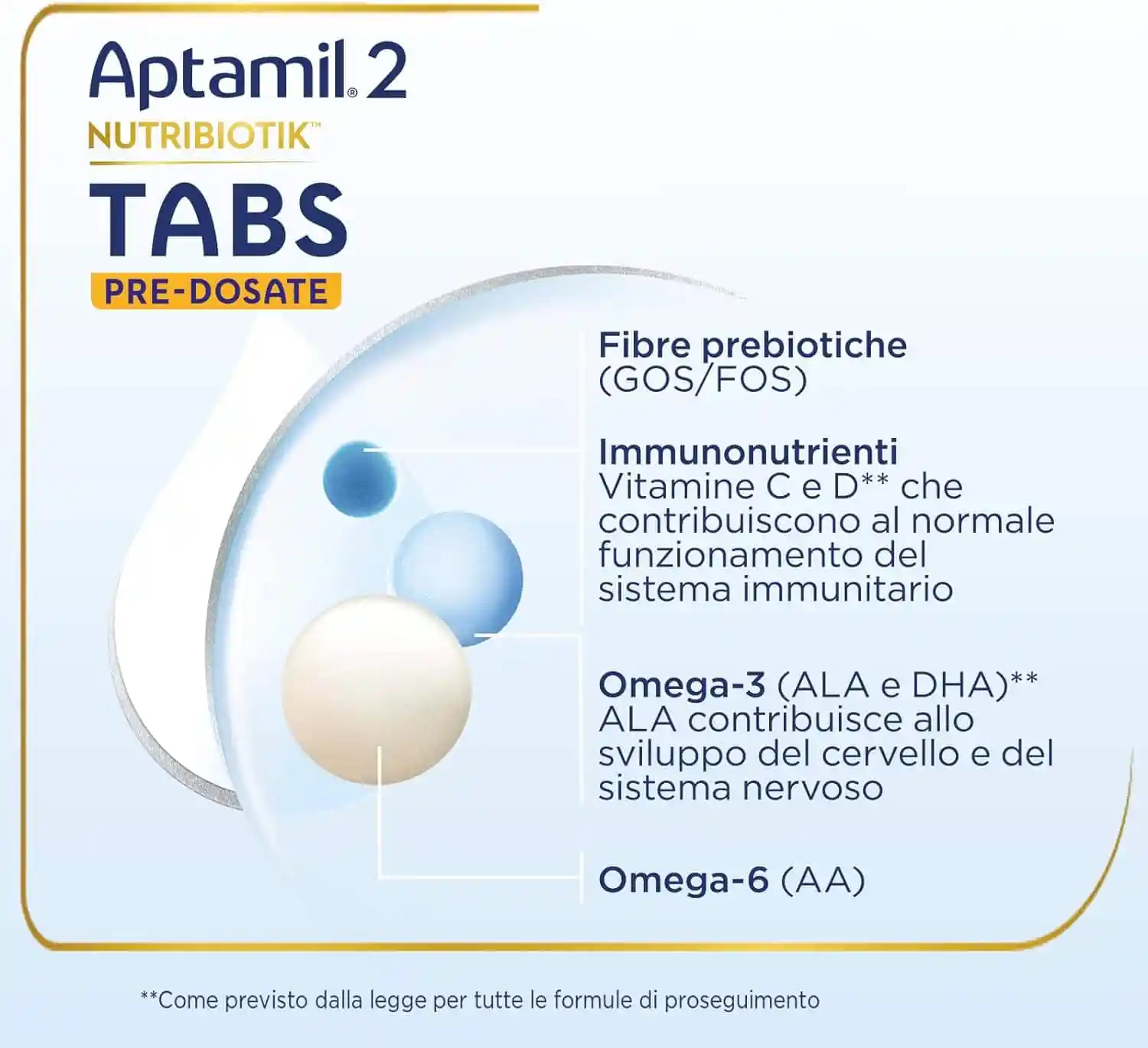 Il latte materno è l’alimento ideale per il lattante ed è raccomandato come alimento esclusivo fino al 6° mese e come componente lattea di una dieta equilibrata durante lo svezzamento e anche dopo l’anno di vita. Quando manca o non è sufficiente, è consigliabile utilizzare un latte per lattanti esclusivamente dietro il consiglio del Pediatra. Aptamil® Nutribiotik™ 2 TABS pre-dosate è idoneo per il lattante solo dopo il compimento del 6° nese, non deve essere utilizzato come sostituto del latte materno nei primi 6 mesi di vita ed è da intendersi come parte di un’alimentazione diversificata. L’inizio dello svezzamento deve avvenire solo seguendo le indicazioni del Pediatra