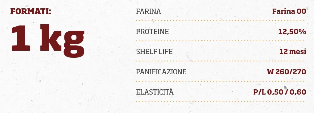 Farina ideale per impasti ben idratati, leggeri e a lievitazione perfetta. Consigliata per la classica pizza napoletana.
