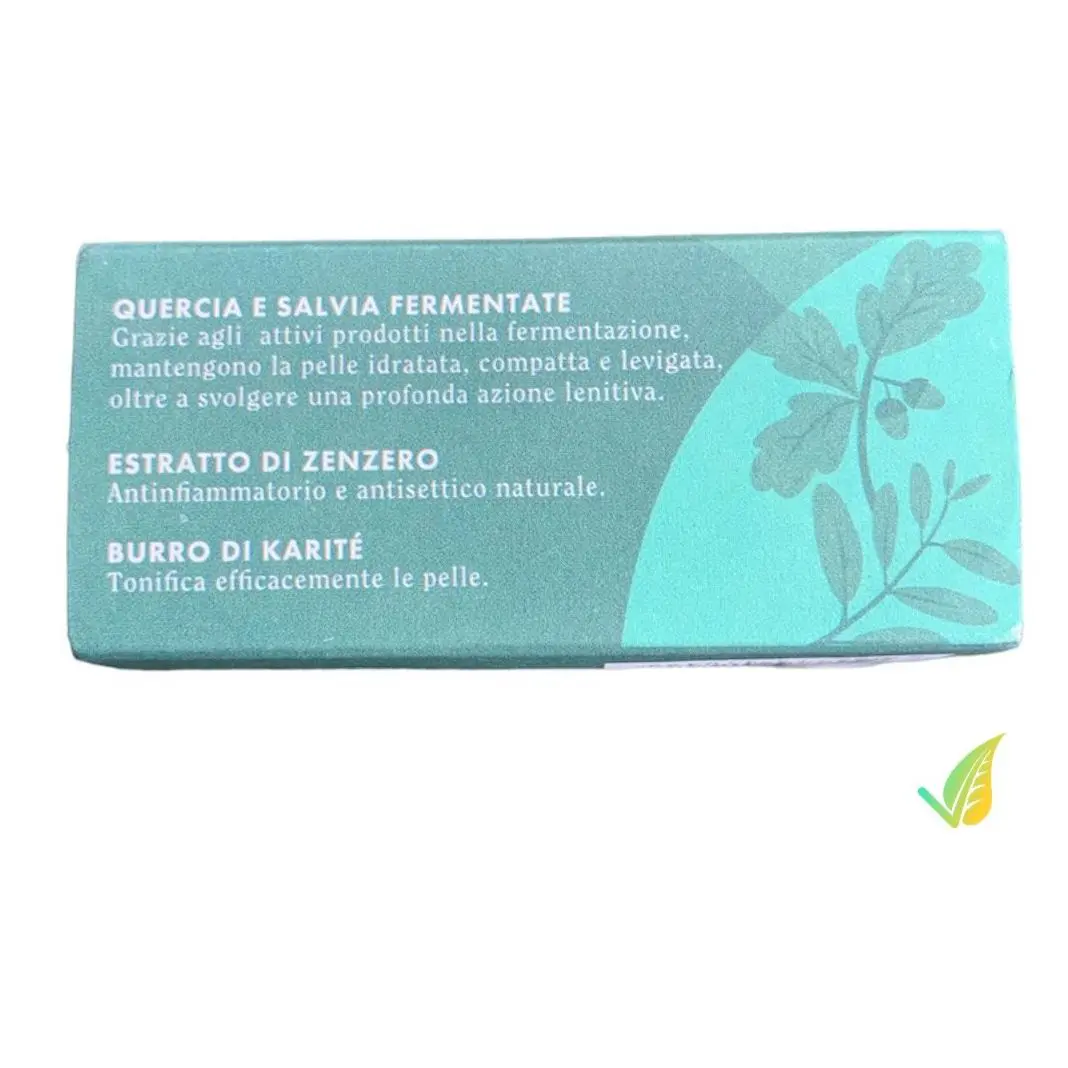 La quercia fermentata ricca di vitamina B12 e tannino, responsabili del forte potere idratante capace di contrastare le screpolature e lisciare la pelle del viso, incontra la salvia fermentata, in grado di lenire ed eliminare le impurità, rigenerando la pelle del viso e donando freschezza.