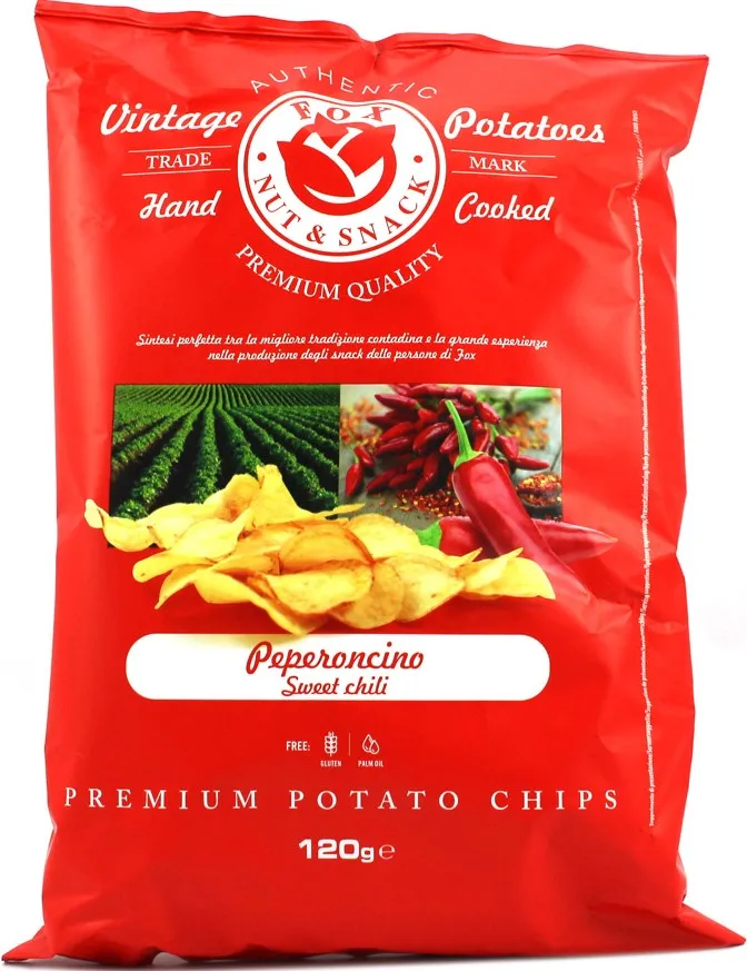 Le Patatine Fox Italia Vintage Potatoes al peperoncino incarnano la filosofia “Dalla fattoria al mercato” dell’azienda italiana. Questo snack rappresenta il massimo del made in Italy, coniugando la migliore tradizione contadina con l’ampia esperienza di Fox nella produzione di snack. Uno snack autentico, realizzato solo con ingredienti di qualità, croccante, senza glutine e ricco di gusto.