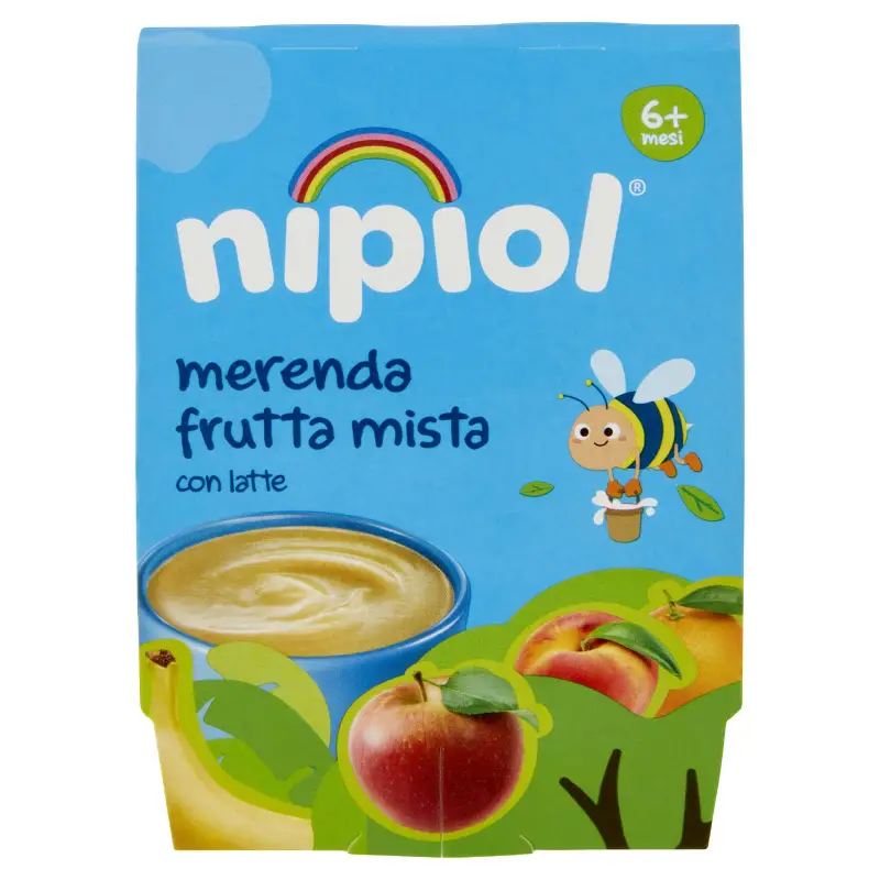 Prodotto merenda omogeneizzato a base di frutta con latte intero in polvere. Prodotto indicato a partire dal 6° mese compiuto, salvo diverso parere del pediatra.