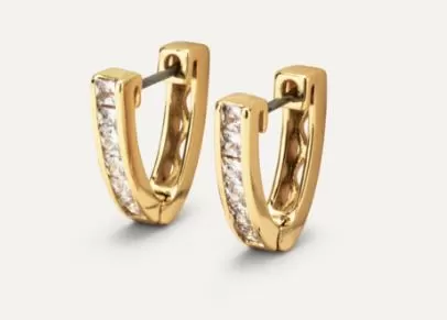 Orecchini testati al Nichel, Cadmio e Piombo, con perno in acciaio chirurgico. Orecchini a cerchio Imma oro. Cerchietto a V con pietre carré. Chiusura a cerniera Chiusura a cerniera