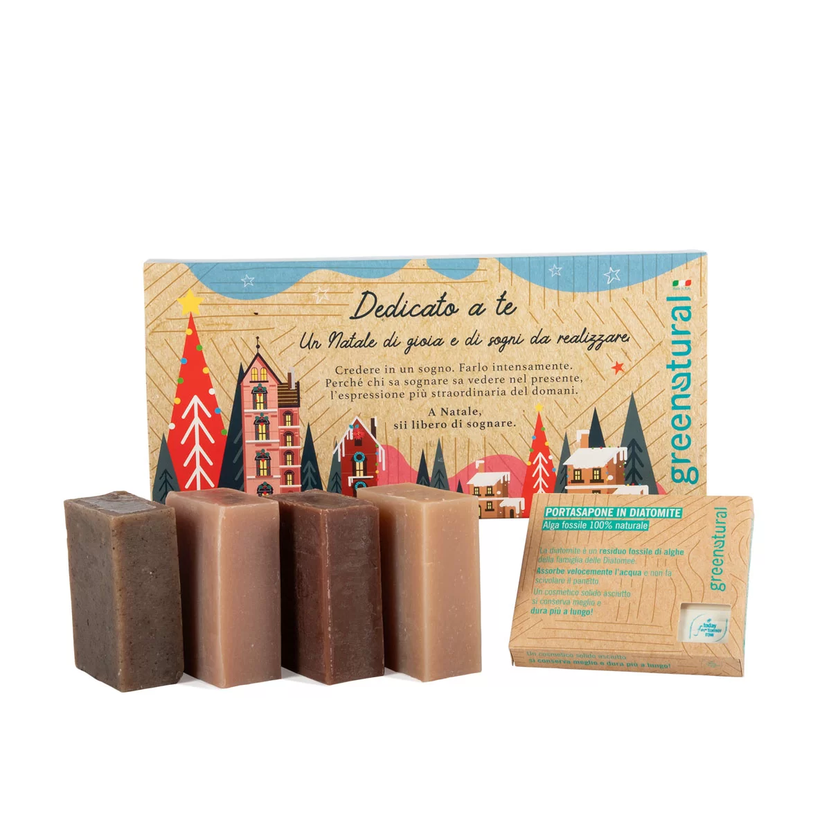 Cofanetto con 4 saponi Prezioso cofanetto con 4 saponi artigianali fatti a mano come una volta e un portasapone in diatomite, alga fossile 100% naturale. Le saponette artigianali hanno delle speciali fragranze dedicate al Natale che non sono presenti nel normale assortimento, questo rende il regalo ancora più esclusivo. Le quattro saponette artigianali dalle fragranze dolci e calde sono: Cioccolato Vaniglia Fiordilatte Caffè Incluso nel cofanetto il porta sapone in Diatomite