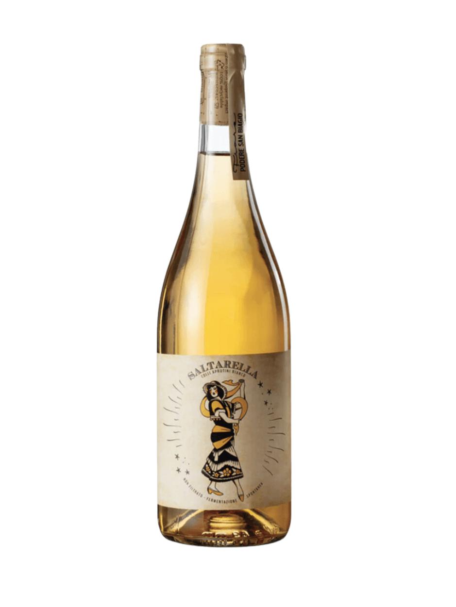 Il Saltarella 2023 di Podere San Biagio è un vino bianco vivace e spensierato, che celebra le tradizioni abruzzesi con freschezza e autenticità. Questo vino, un blend unico di Passerina (50%), Trebbiano (20%), Pecorino (10%), Malvasia (10%) e Moscato (10%), è prodotto nel cuore delle Colline Teramane, a Controguerra. Le uve, raccolte rigorosamente a mano, vengono vinificate separatamente con una fermentazione spontanea. Non filtrato e senza chiarifiche, il Saltarella mantiene tutta la sua naturalezza. La pressatura diretta e l’assenza di macerazione lo rendono un vino fresco, aromatico e caratterizzato da una grande bevibilità. Al naso, delicate note fruttate e floreali si intrecciano a una piacevole sensazione minerale. Al palato, la freschezza e la sapidità emergono, regalando un sorso equilibrato e rinfrescante, ideale per momenti conviviali e serate estive. Il nome “Saltarella” è un omaggio al ballo tradizionale e folkloristico dell’Abruzzo, simbolo di gioia e festa. Questo vino, come il ballo a cui si ispira, è leggero, allegro e perfetto per celebrare la convivialità.