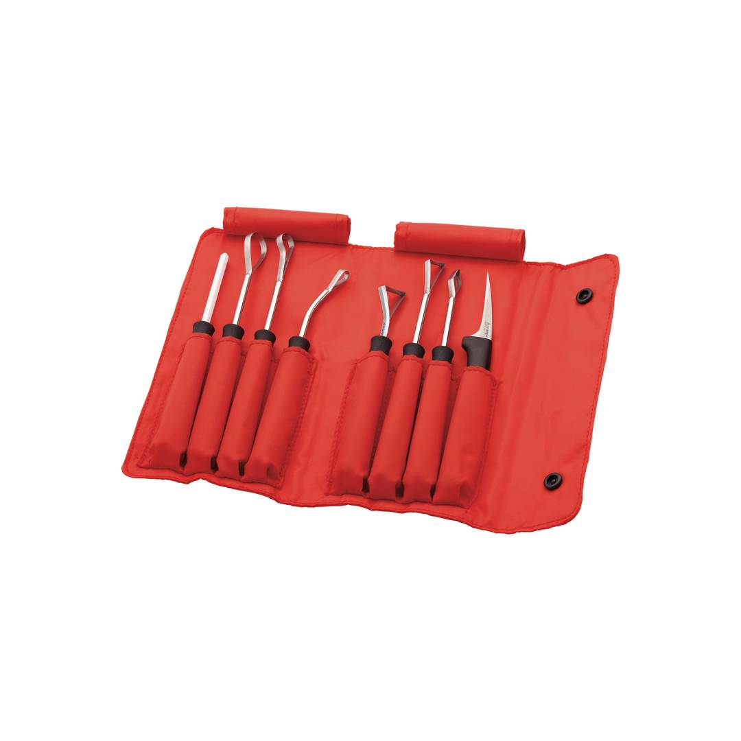 E’ composto di: coltello siam, coltello intaglio M, N, O, P, Q, R e un acciaino in ceramica.