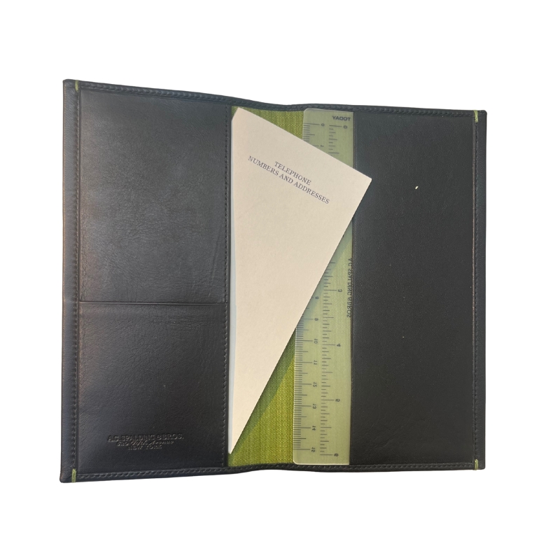 Custodia per agenda in vera pelle colore nero, dettagli e interno verde.
