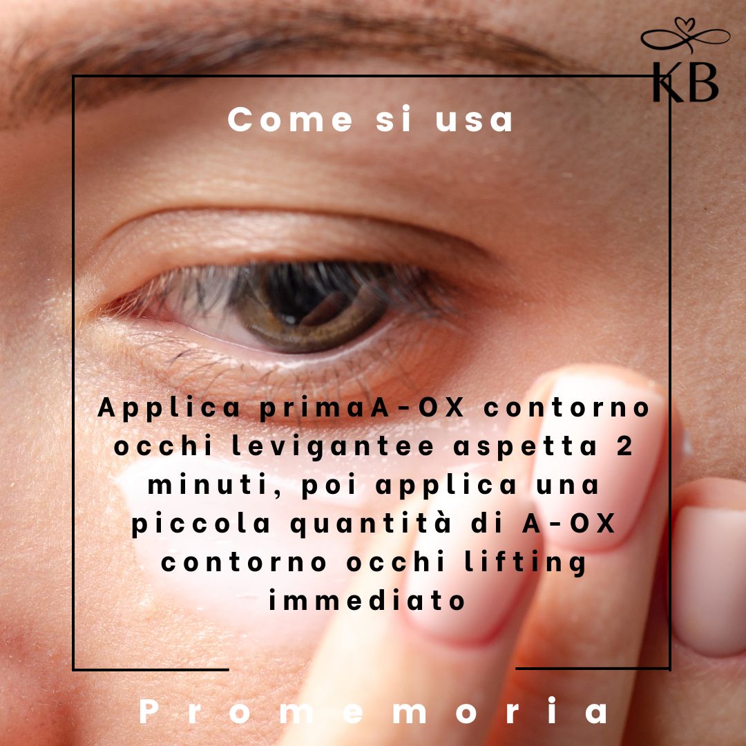 Haloxyl™ (Composto di 3 principi attivi)[/et_pb_toggle][et_pb_toggle title=”INCI” closed_toggle_text_color=”#251b63″ icon_color=”#251b63″ open_icon_color=”#251b63″ _builder_version=”4.16″ _module_preset=”default” body_font_size=”15px” body_line_height=”1.8em” custom_margin=”||2%||false|false” global_colors_info=”{}”]Aqua, Magnesium aluminum silicate, Butylene glycol, Sodium silicate, Chrysin, Glycerin, Acetyl tetrapeptide-5, Palmitoyl oligopeptide, Palmitoyl tetrapeptide-7, Xanthan gum, Phenoxyethanol, Ethylhexylglycerin, Steareth-20, n-Hydroxysuccinimide, CI 19140.[/et_pb_toggle][et_pb_toggle title=”CONSIGLI D’USO” closed_toggle_text_color=”#251b63″ icon_color=”#251b63″ open_icon_color=”#251b63″ _builder_version=”4.21.2″ _module_preset=”default” body_font_size=”15px” body_line_height=”1.8em” global_colors_info=”{}”]La corretta stesura del prodotto: metti un piccolo quantitativo sui polpastrelli del dito pollice ed anulare e strofina leggermente affinché si scaldi. Dopodiché applica nella zona contorno occhi, evitando la palpebra superiore, SOLO dopo aver messo A-OX Contorno Occhi Levigante. Non mettere il prodotto sulle labbra.