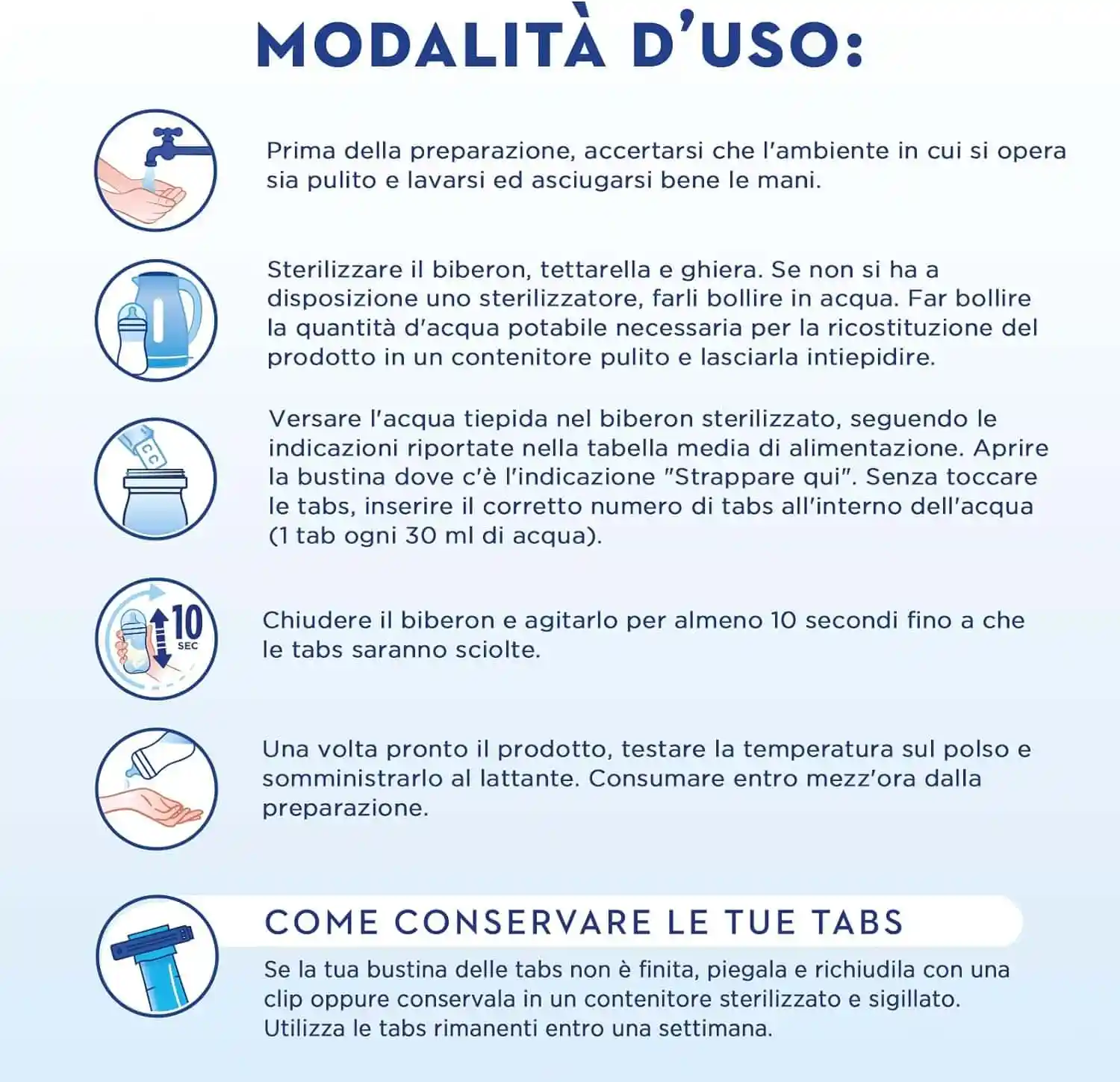 Il latte materno è l’alimento ideale per il lattante ed è raccomandato come alimento esclusivo fino al 6° mese e come componente lattea di una dieta equilibrata durante lo svezzamento e anche dopo l’anno di vita. Quando manca o non è sufficiente, è consigliabile utilizzare un latte per lattanti esclusivamente dietro il consiglio del Pediatra. Aptamil® Nutribiotik™ 2 TABS pre-dosate è idoneo per il lattante solo dopo il compimento del 6° nese, non deve essere utilizzato come sostituto del latte materno nei primi 6 mesi di vita ed è da intendersi come parte di un’alimentazione diversificata. L’inizio dello svezzamento deve avvenire solo seguendo le indicazioni del Pediatra