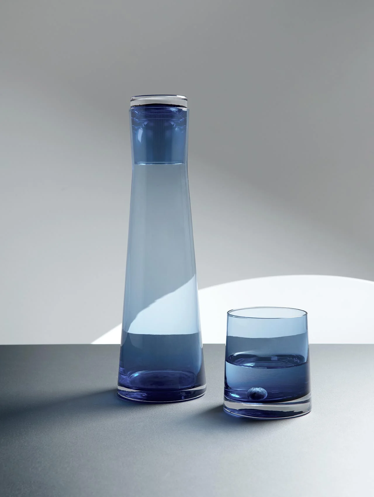 Caraffa con capacità di 700 ml realizzata in vetro massiccio nel colore blu cielo.