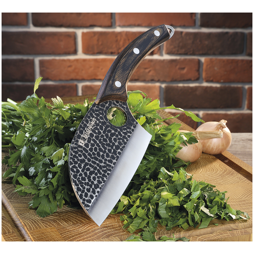 Il manico curvo in legno di pakka e il foro nella lama permettono totale controllo e perfetto equilibrio nel maneggiare col coltello.