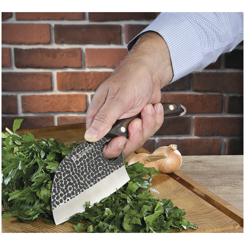 Perfetto per tagliare erbette, odori da cucina, frutta, verdura, pesce. La lama ampia può sostituire la classica mezzaluna e permette di raccogliere quanto appena affettato.
