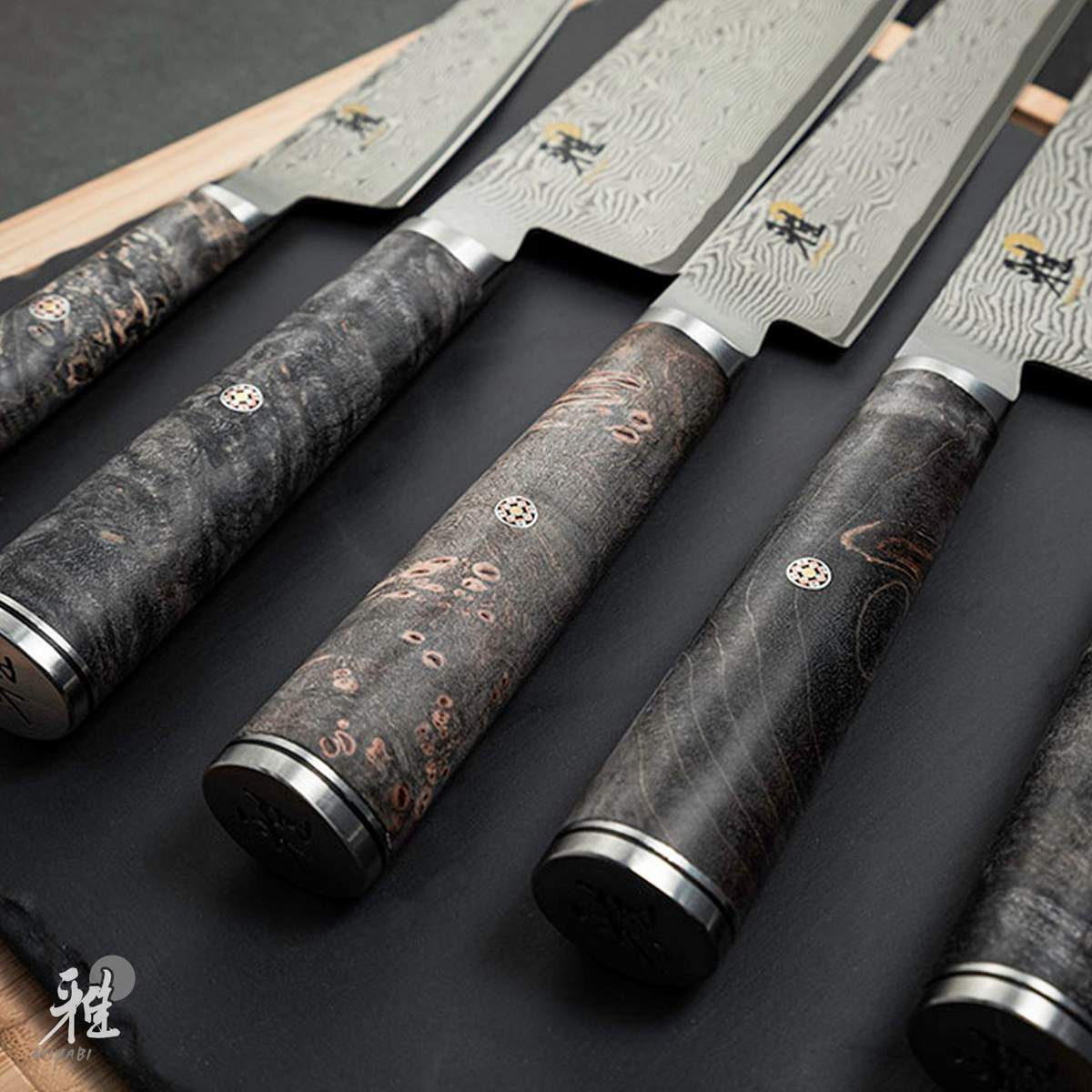 L’impugnatura, sagomata a “D” cosi da adattarsi in modo ottimale alla mano, è realizzata in un pregiato legno di acero, con pin a mosaico posizionato al centro del manico. Un dettaglio sottile e stupefacente che sottolinea la sublime finitura di questo capolavoro d’arte giapponese.