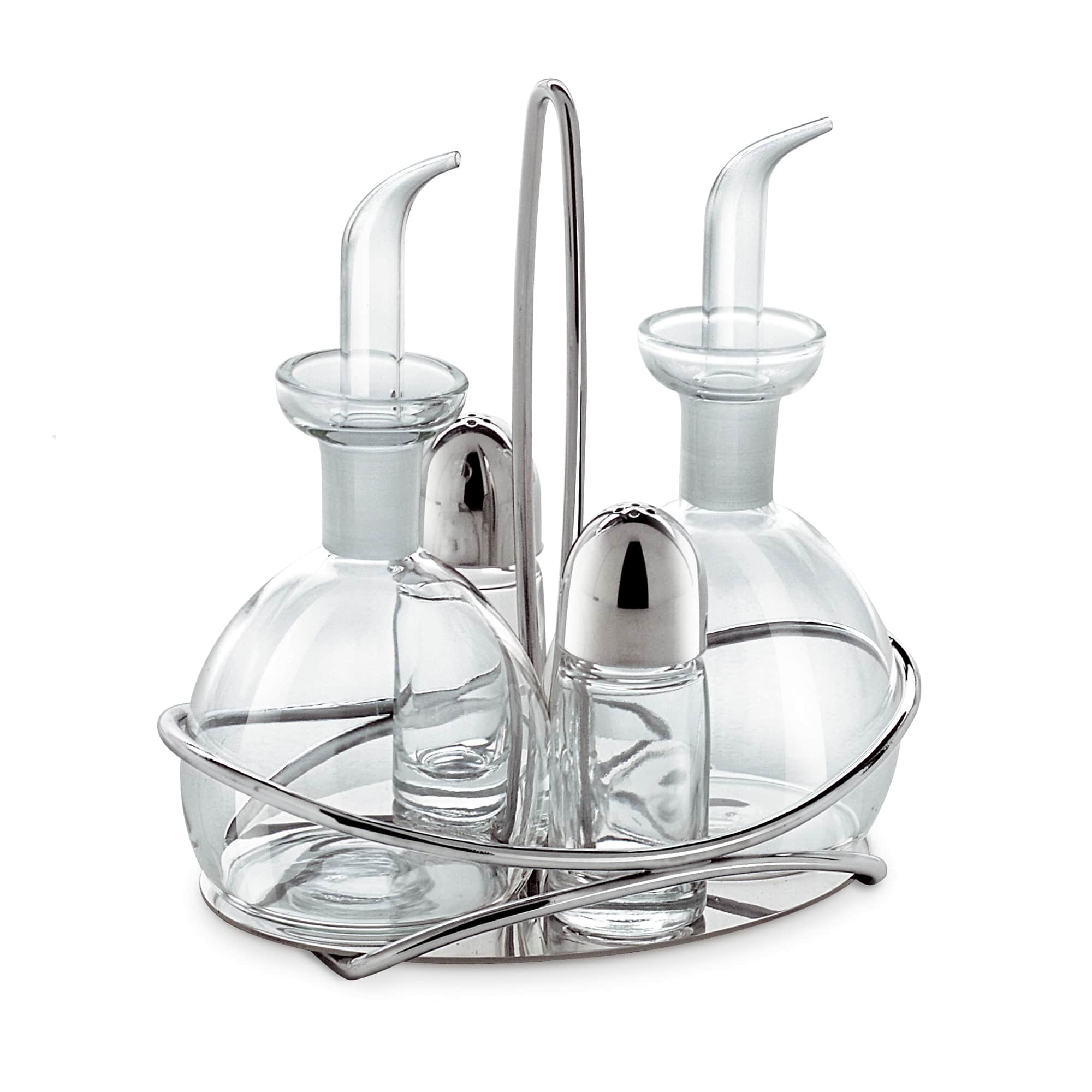 Porta condimenti in acciaio con due oliere rotonde 250 ml e sale e pepe in vetro.