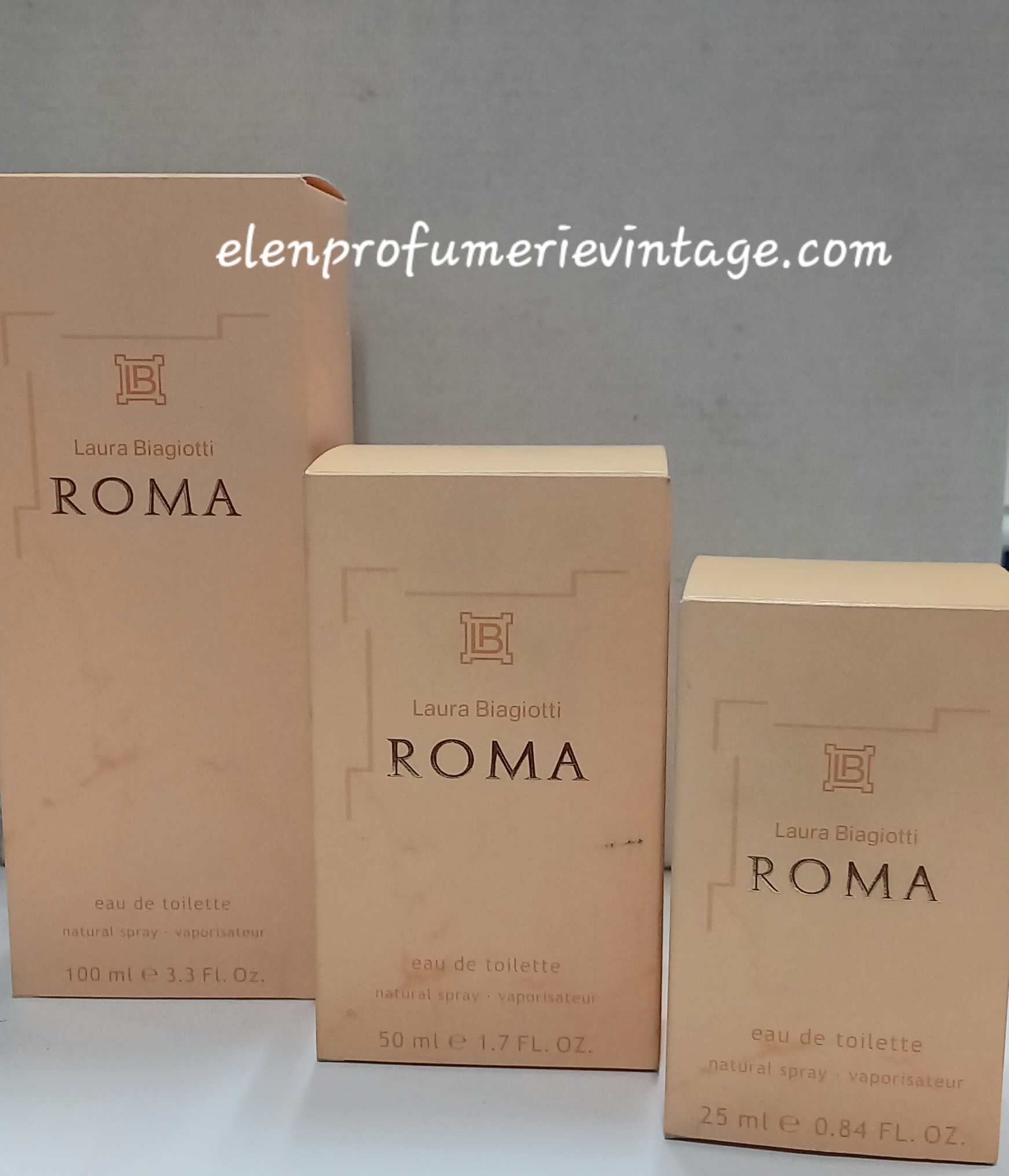 Roma è una fragranza femminile di Laura Biagiotti del gruppo Ambrato Speziato, che fu lanciata sul mercato nel 1988 e noi vi proponiamo una sua edizione vintage targata Procter & Gamble con 3 formati della linea. Le note di testa sono Pompelmo Rosa, Menta, Bergamotto di Sicilia, Ribes Nero e Giacinto; le note di cuore sono Garofano, Gelsomino, Rosa e Mughetto; le note di base sono Mirra, Ambra, Vaniglia, Sandalo, Muschio di Quercia, Zibetto, Patchouli di Singapore e Muschio.