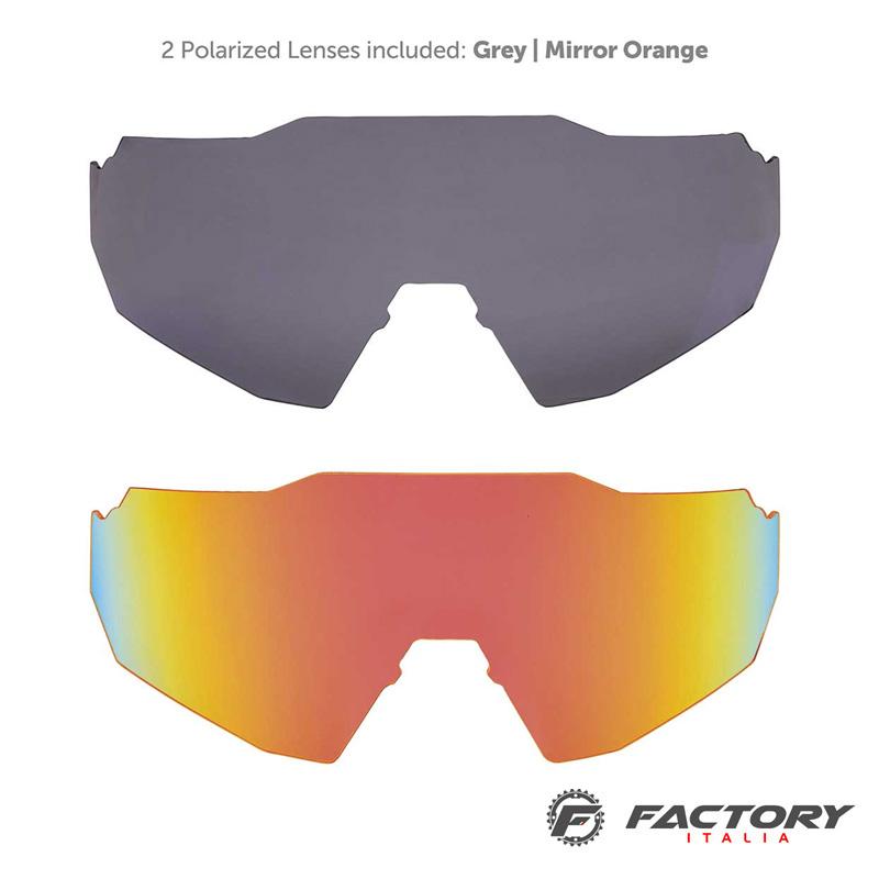 Disponibile con telaio in colorazione nera, nella sua confezione sono comprese due lenti (grey e mirror orange), un astuccio rigido, una morbida custodia ed un inserto per contenere le lenti graduate.