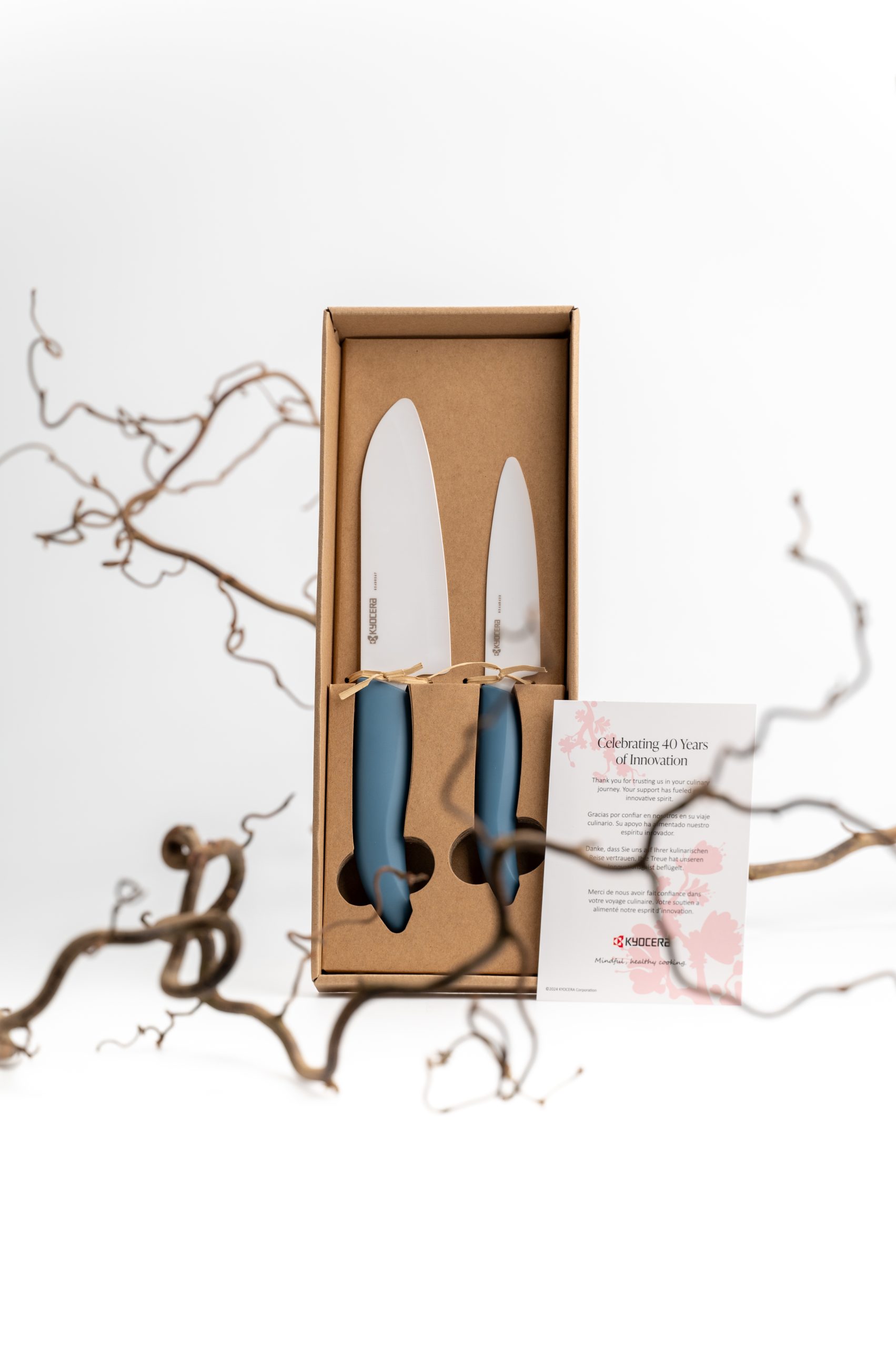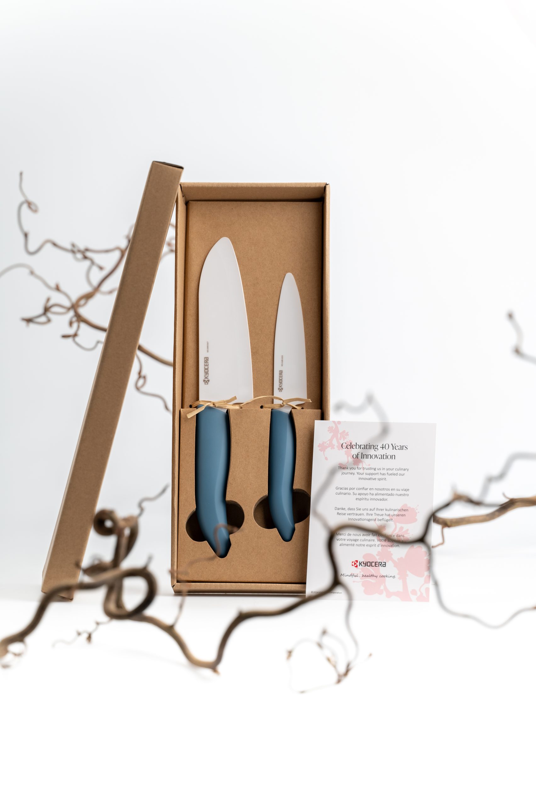 Kyocera Japan festeggia i suoi primi 40 anni di attività con un set di 2 coltelli dalla lama in ceramica bianca.
