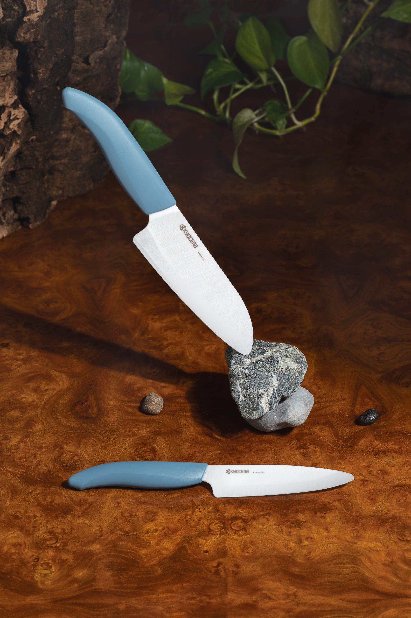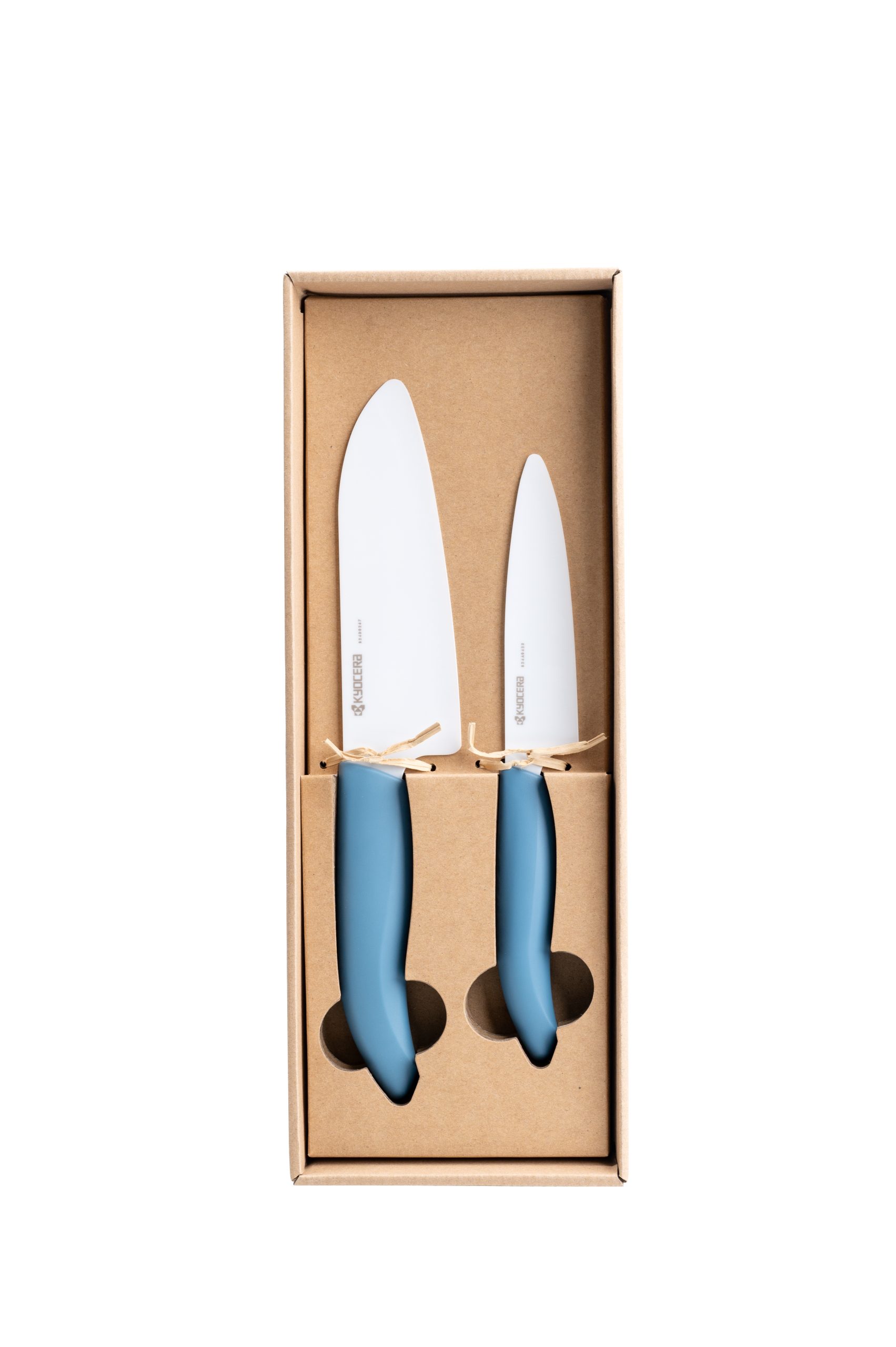 Set Coltelli Cucina in Ceramica “Kyocera Japan 40th Anniversary” – coltello Santoku cm 14 & Universale cm 11 manico Blu Egeo