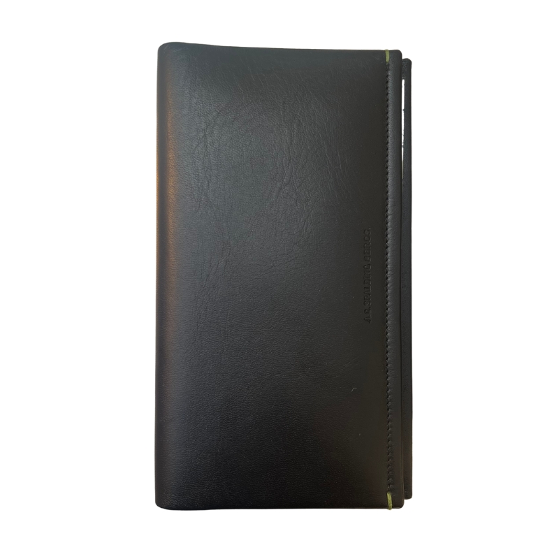 Custodia per agenda in vera pelle colore nero, dettagli e interno verde.