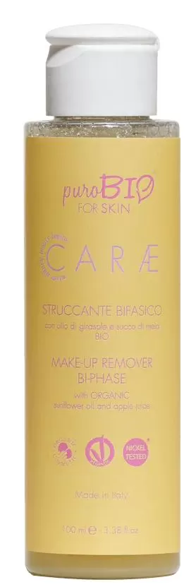 Struccante Bifasico TIPOLOGIA DI PELLE: Tutte FUNZIONE: Struccante Bio Elimina le impurità e lascia la tua pelle pulita senza tracce di make up. Il detergente bifasico puroBIO cosmetics è una lozione bifasica che deterge affondo la pelle e rimuove anche il trucco più pesante. Lascia la pelle del viso morbida e delicatamente profumata; arricchito con olio di girasole biologico, succo di mela*, olio di olivello spinoso*, glicerina vegetale, zucchero di canna*, zuccheri di origine vegetale ad azione idratante, olio di ricino e vitamina E (*bio). Il prodotto è nickel tested, vegan ok, certificato biologico da ccpb. Formato: