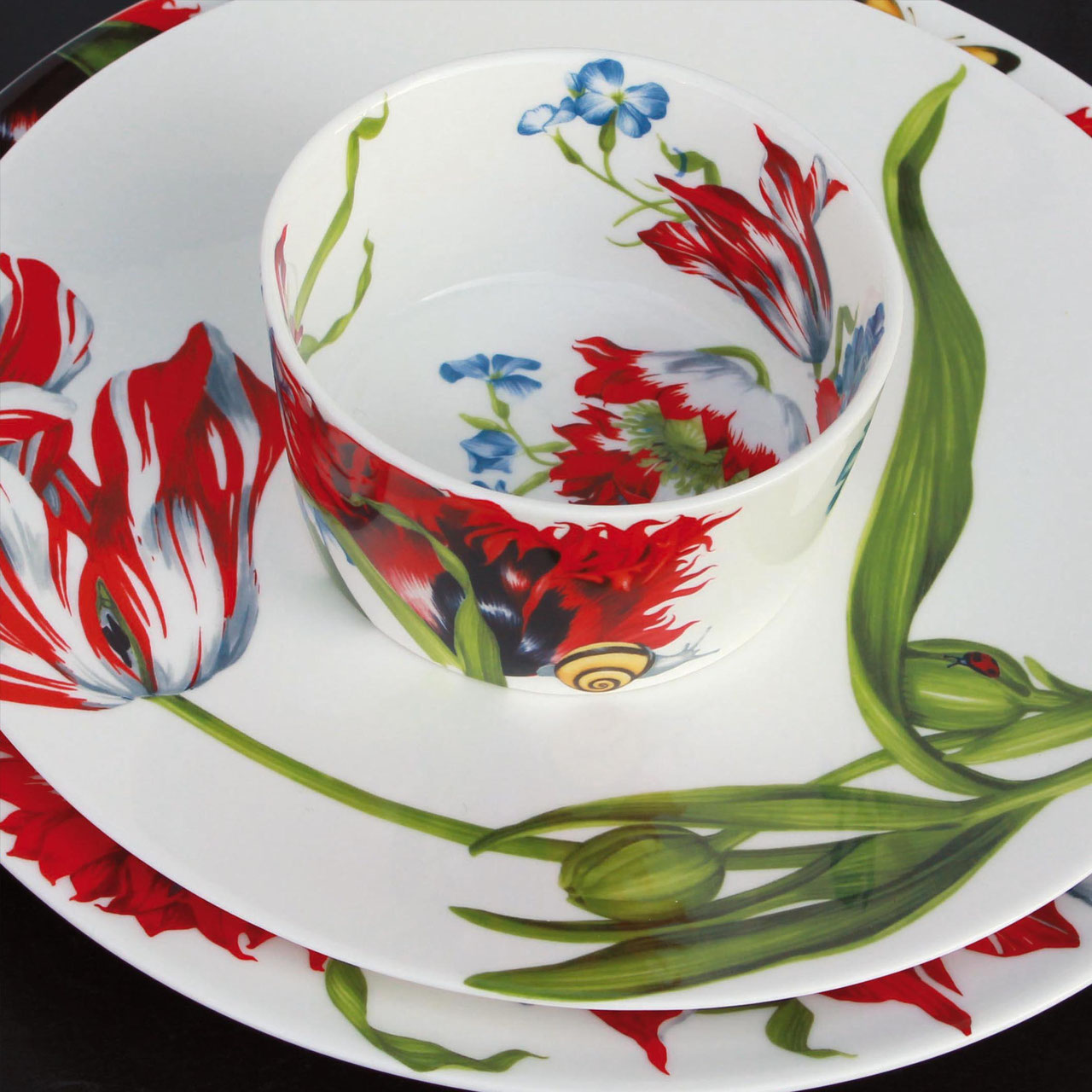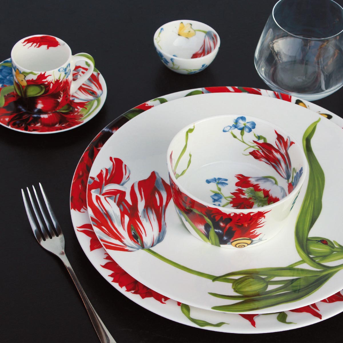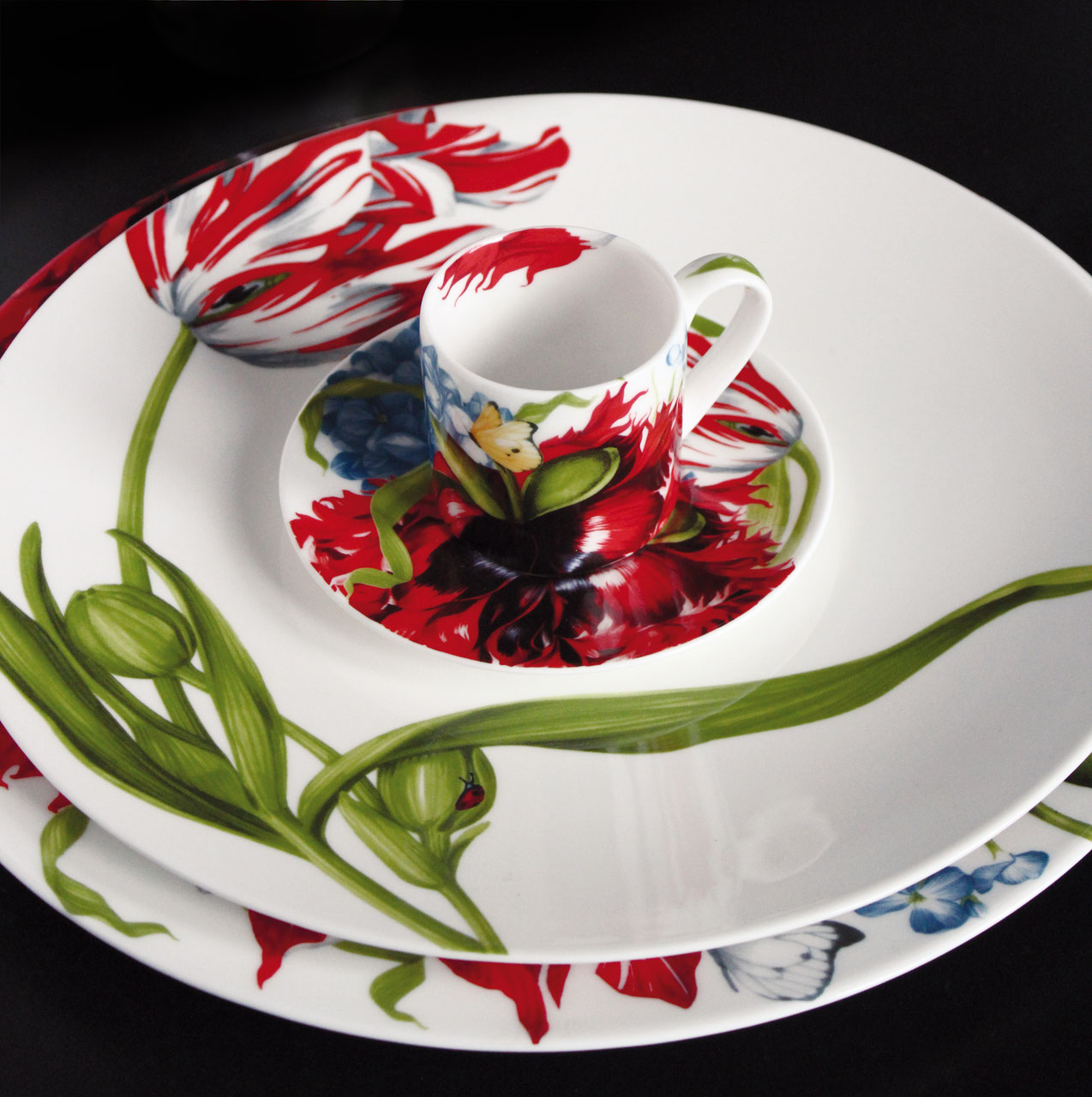 Sono i tulipani sfrangiati, le farfalle, le lumache che si susseguono su nuove morbide forme di porcellana, sul legno di betulla, su tessuti preziosi.