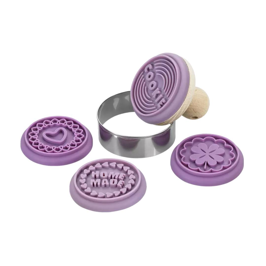 Il set è composto da un timbro in legno sul quale è possibile agganciare 4 differenti mascherine in silicone, create per imprimere facilmente la pasta frolla, la pasta di zucchero e qualsiasi pasta modellabile. Completa il set il tagliapasta in acciaio per tagliare il biscotto tondo.
